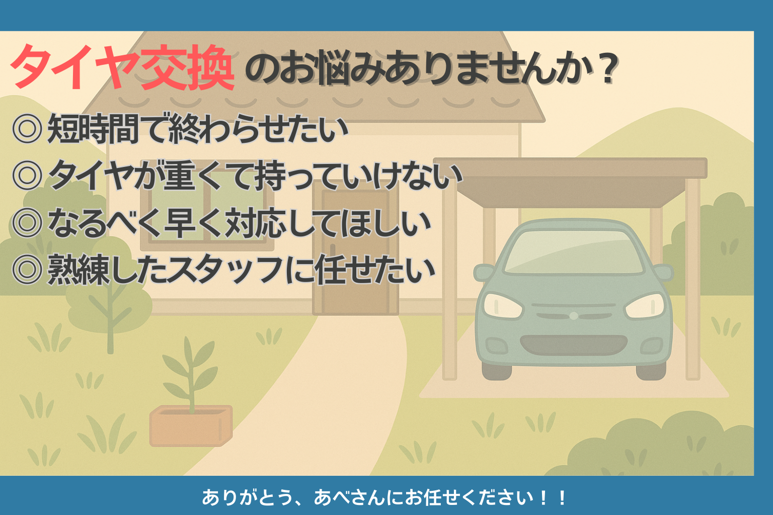 そんなタイヤ交換でお困りの方のために、「ありがとう、あべさん」では出張タイヤ交換を最短即日でいたします。熟練のスタッフが在籍しているため、どんなに広いお庭でもお任せください♪